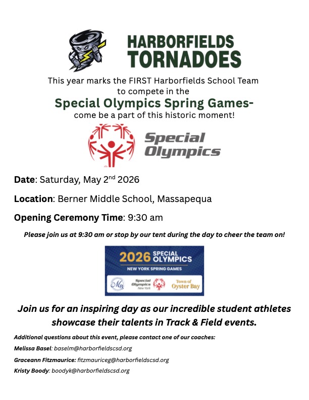 Did you know that the Harborfields Track and Field Team will compete in the Special Olympics for the first time this year? Please bring the entire family in your best HF Spirit Wear to come out in support of our athletes on Saturday, May 2, 2026 at Berner Middle School, located at 50 Carman Mill Road, Massapequa. The opening ceremony will start at 9:30 am. We hope to see you there! Go Tornadoes!