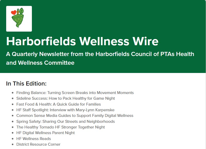 Please take a moment to click on the image below to view the latest edition of the Harborfields Wellness Wire, developed by the PTA Health & Wellness Committee. This newsletter features an interview with our Harborfields Director of Technology and Security Systems, Mary-Lynn Karpenske, who shares thoughtful insight on navigating technology both in school and at home. You’ll also find fitness tips to support digital balance, ideas for packing healthier snacks for busy game nights, how to make better choices when fast food is the only option, bike and outdoor safety reminders as our kids return to the streets and sidewalks, and details about a digital wellness workshop for parents in March and our upcoming Wellness Fair and Healthy Tornado Challenge!