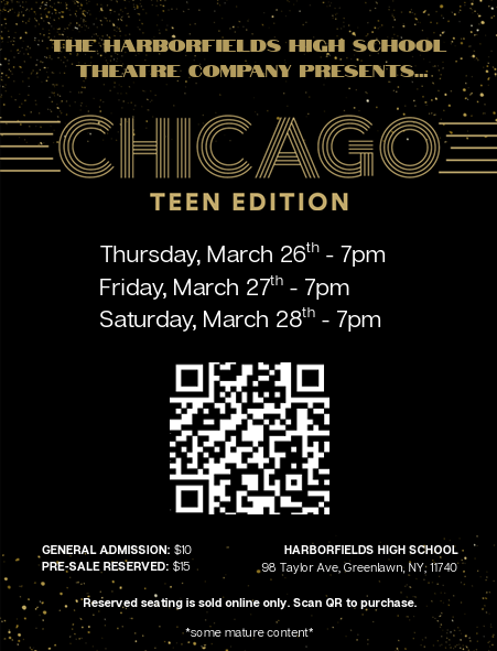 The Harborfields Theatre Co. proudly presents Chicago! Don’t miss your chance to see our students shine on stage in this year’s spring production on March 26, March 27, and March 28 at 7 PM at Harborfields High School. Special dessert reception and performance for seniors on March 25 at 5 PM!